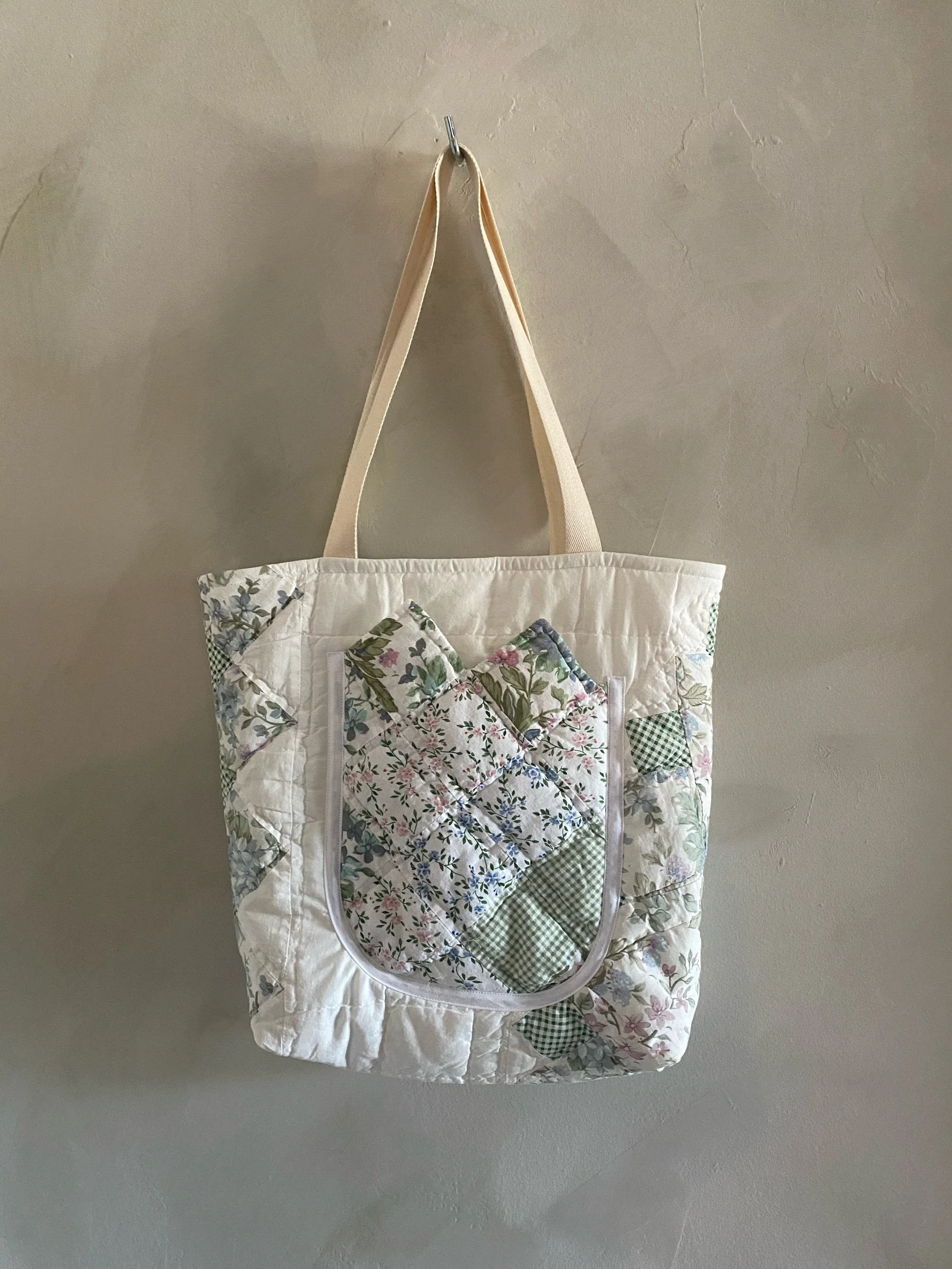 White background with soft pink, blue & green floral fabrics. In near perfect condition, soft to the touch & entirely cotton. Machine pieced, hand-quilted with a white backing.
