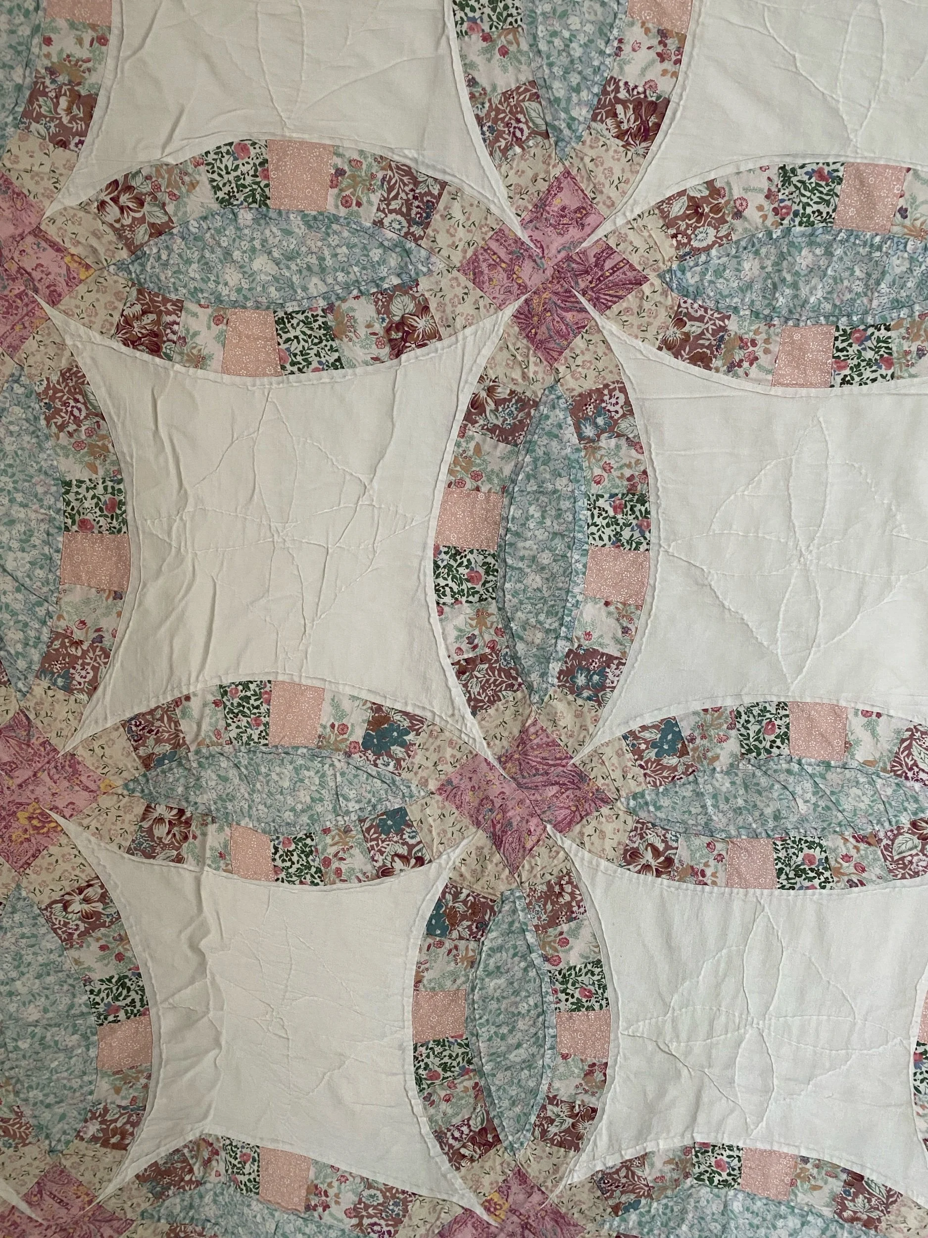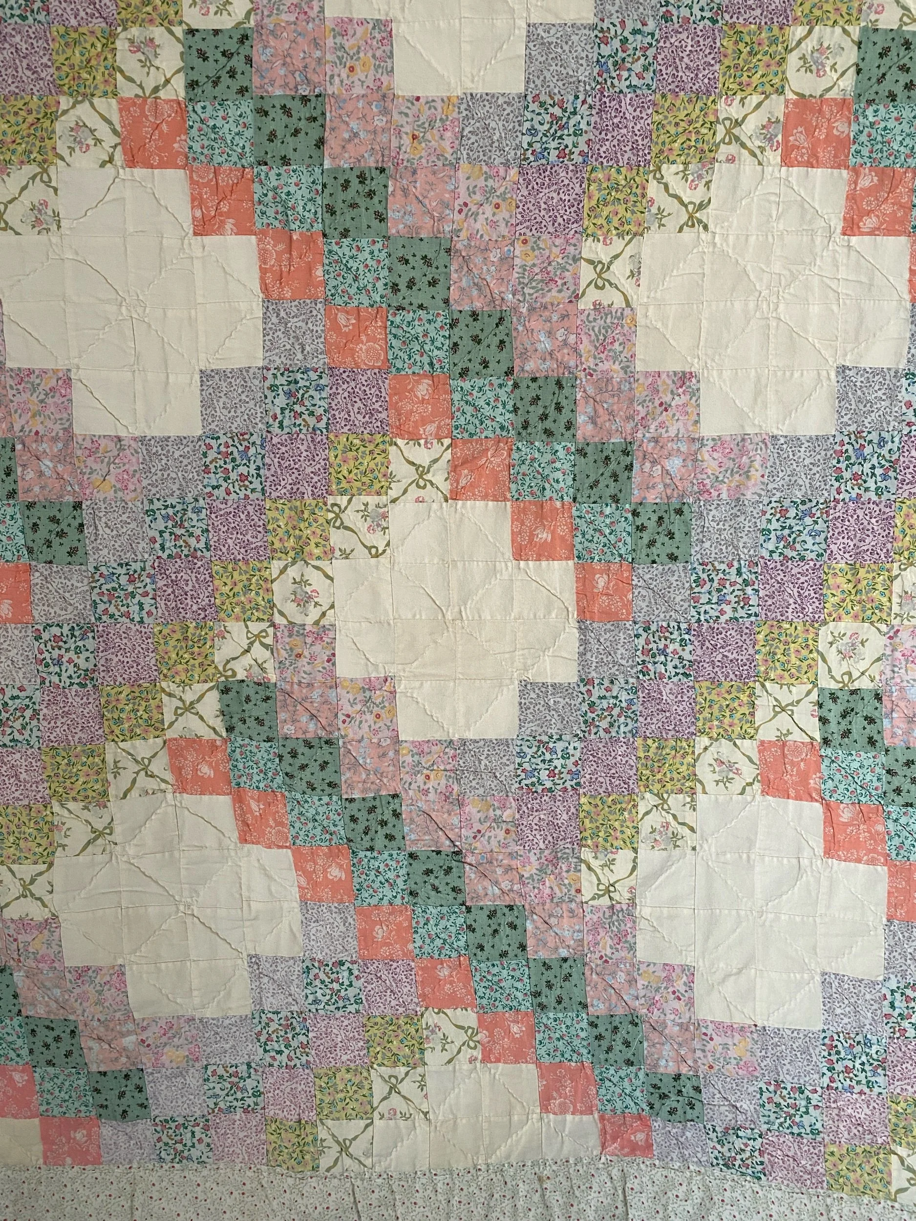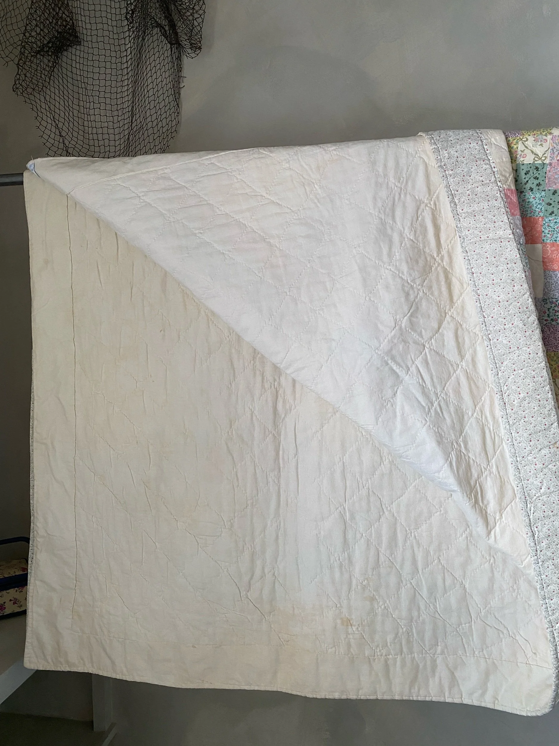 White background with soft pink, blue & green floral fabrics. In near perfect condition, soft to the touch & entirely cotton. Machine pieced, hand-quilted with a white backing.