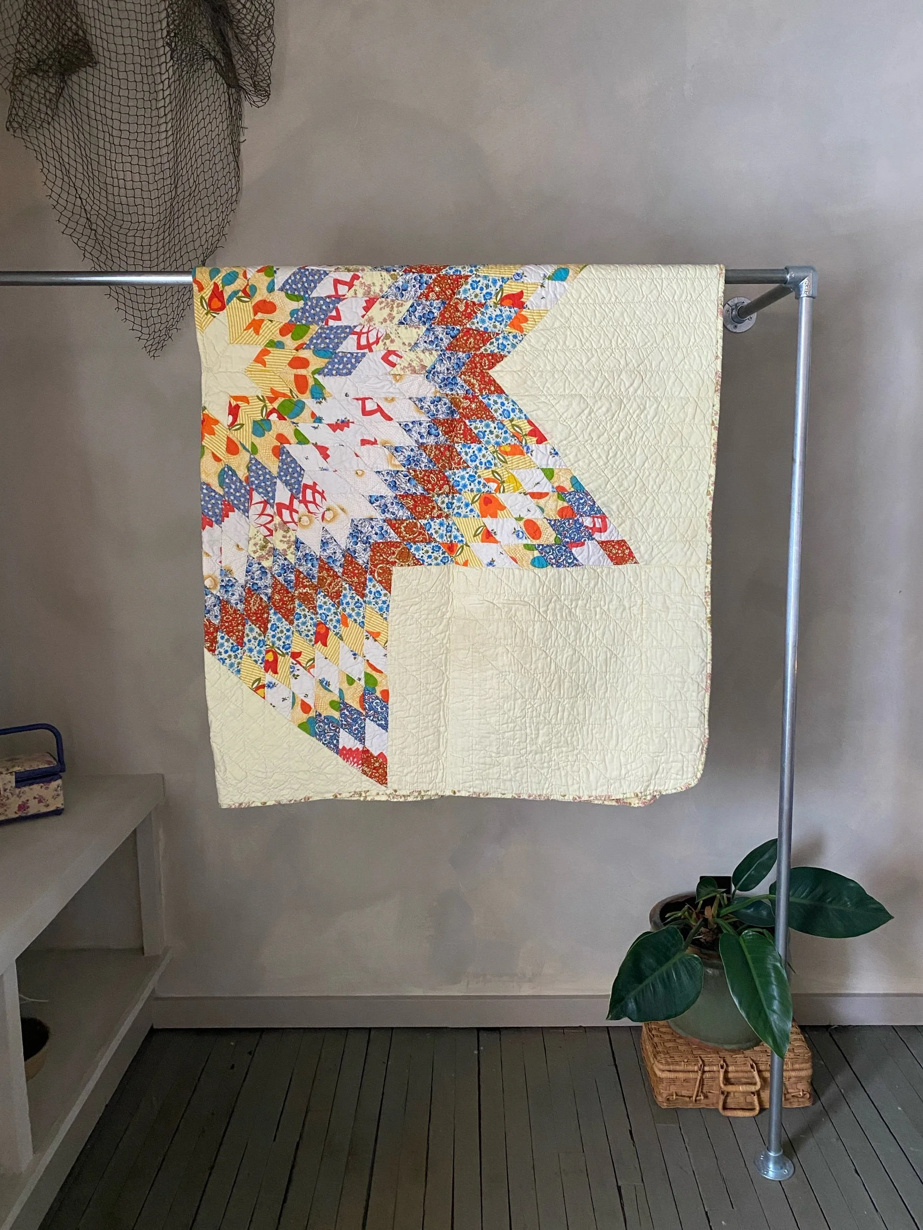Yellow-green background with bright patterned fabrics in a star design. In near perfect pre-loved condition, with a floral backing in the same yellow-green. Machine pieced, hand-quilted.