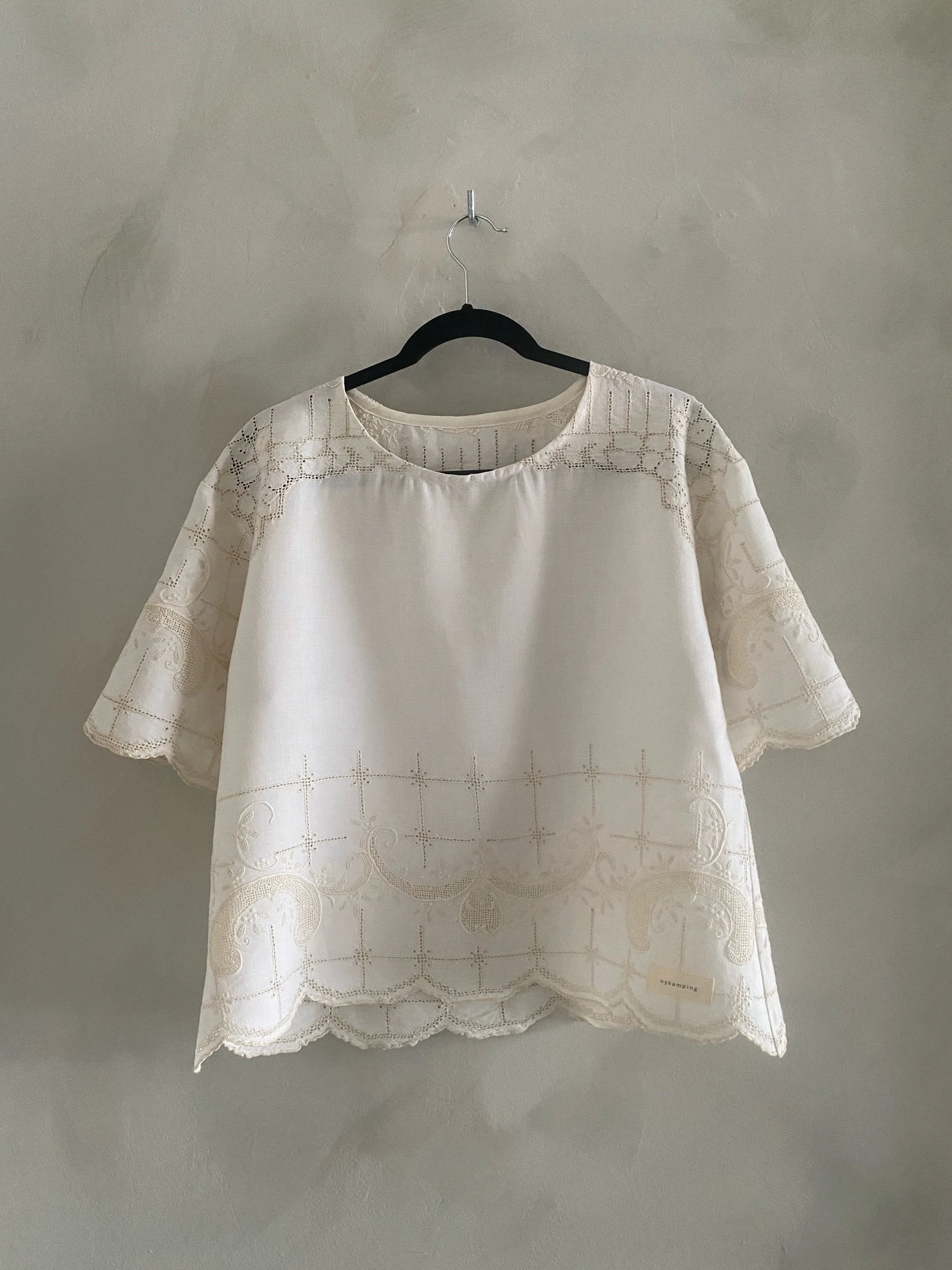 boxy pullover top made from an embroidered linen tablecloth, utilizing original scalloped hemlines all around