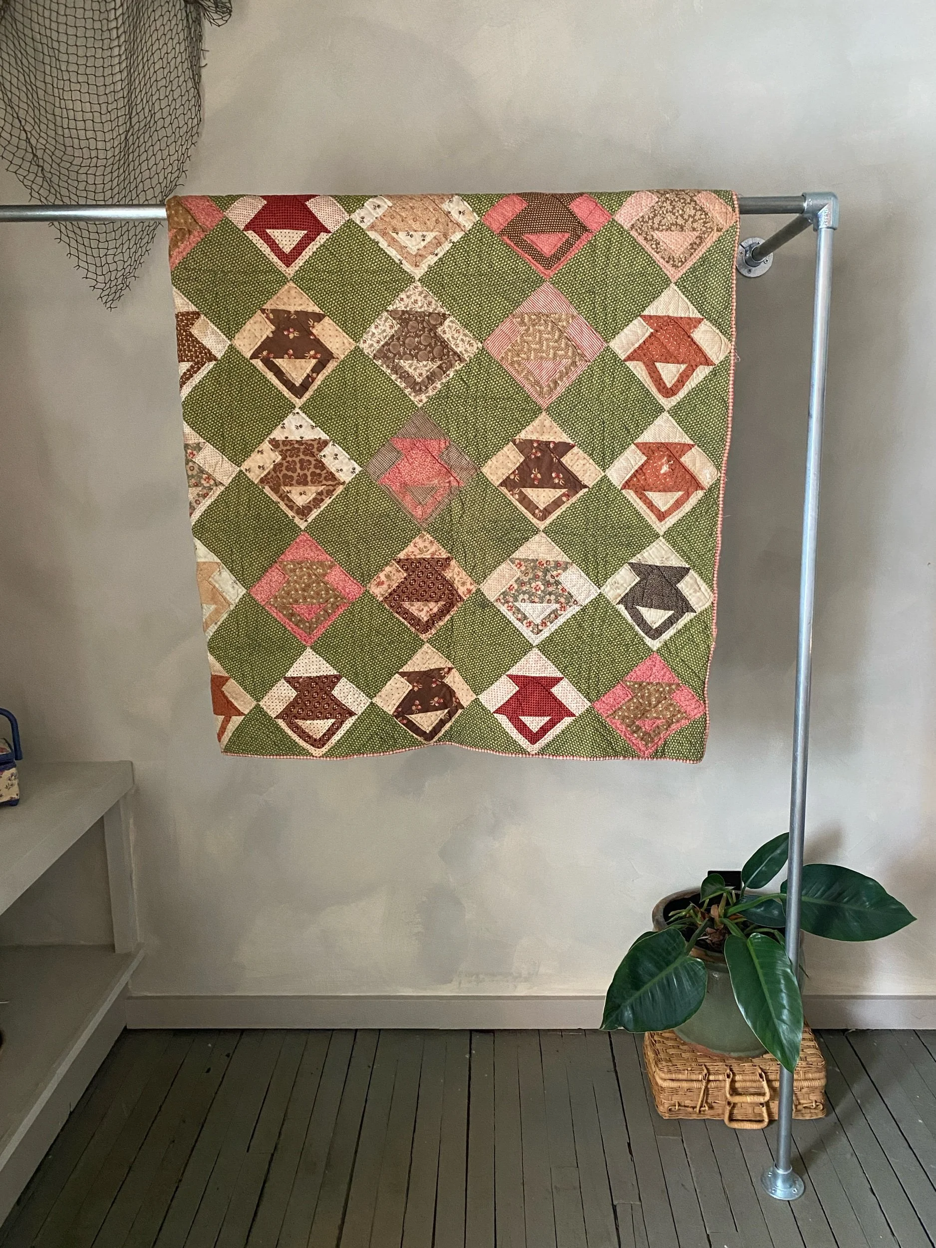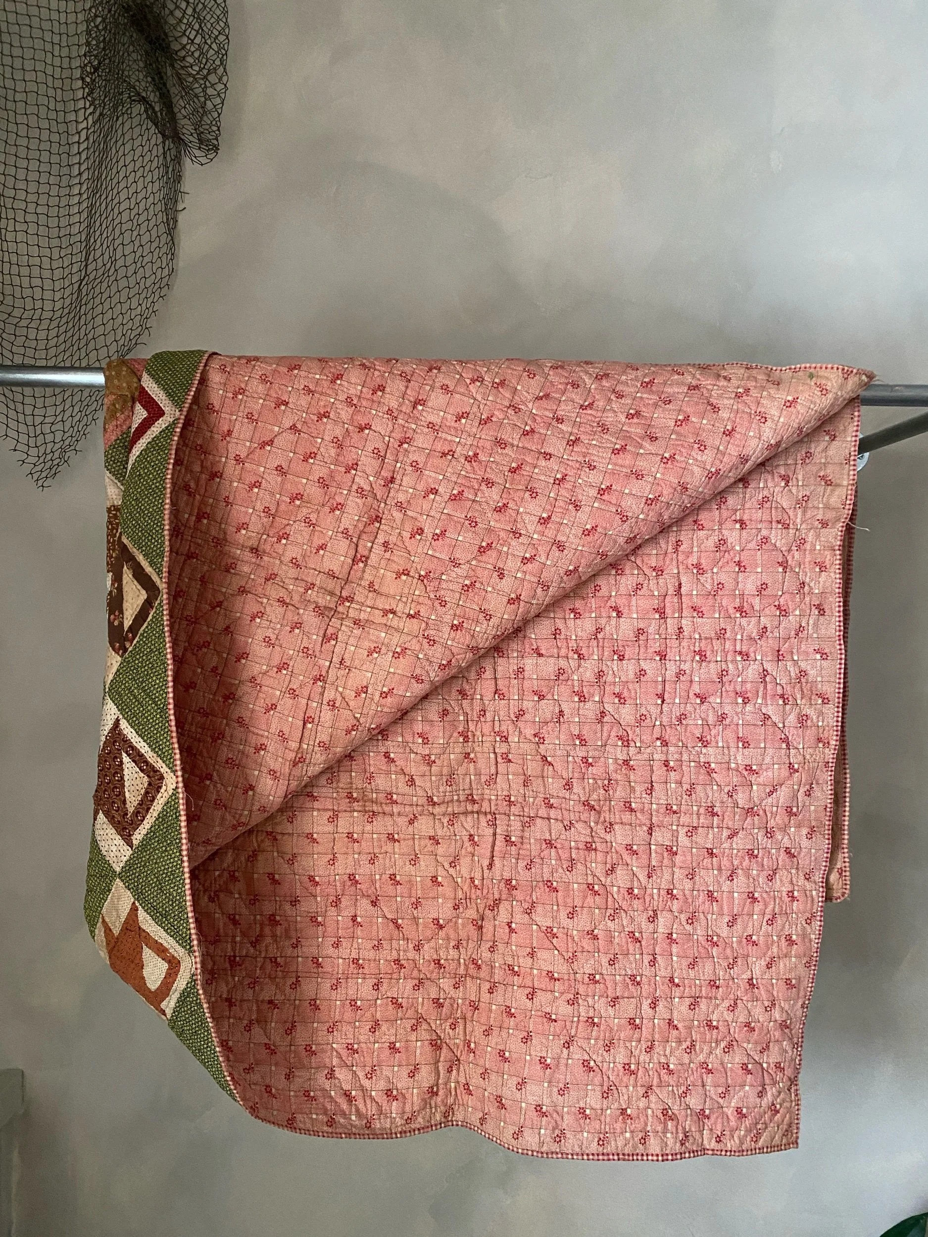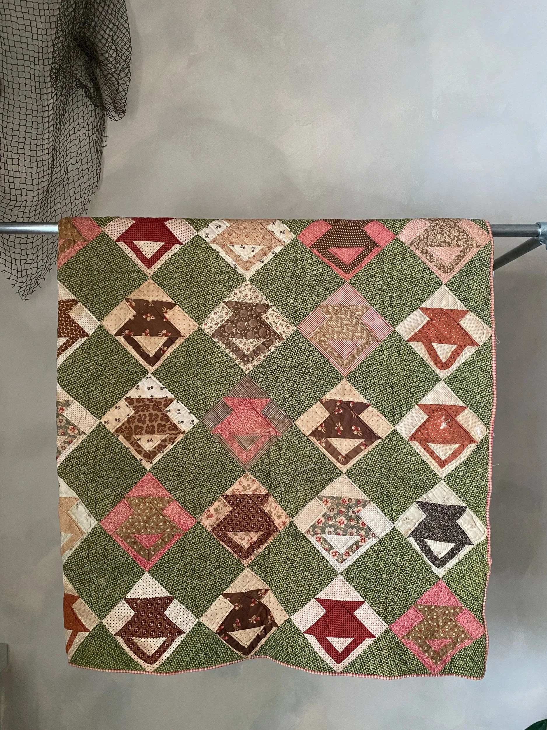 Green background with deep red & pink & brown patterned fabrics. In well-loved condition, soft to the touch & entirely cotton. Hand pieced, hand-quilted.