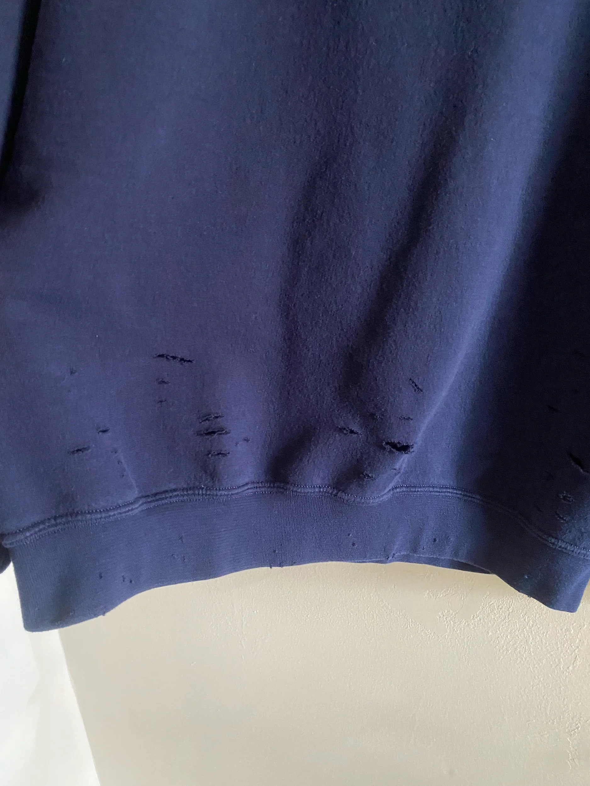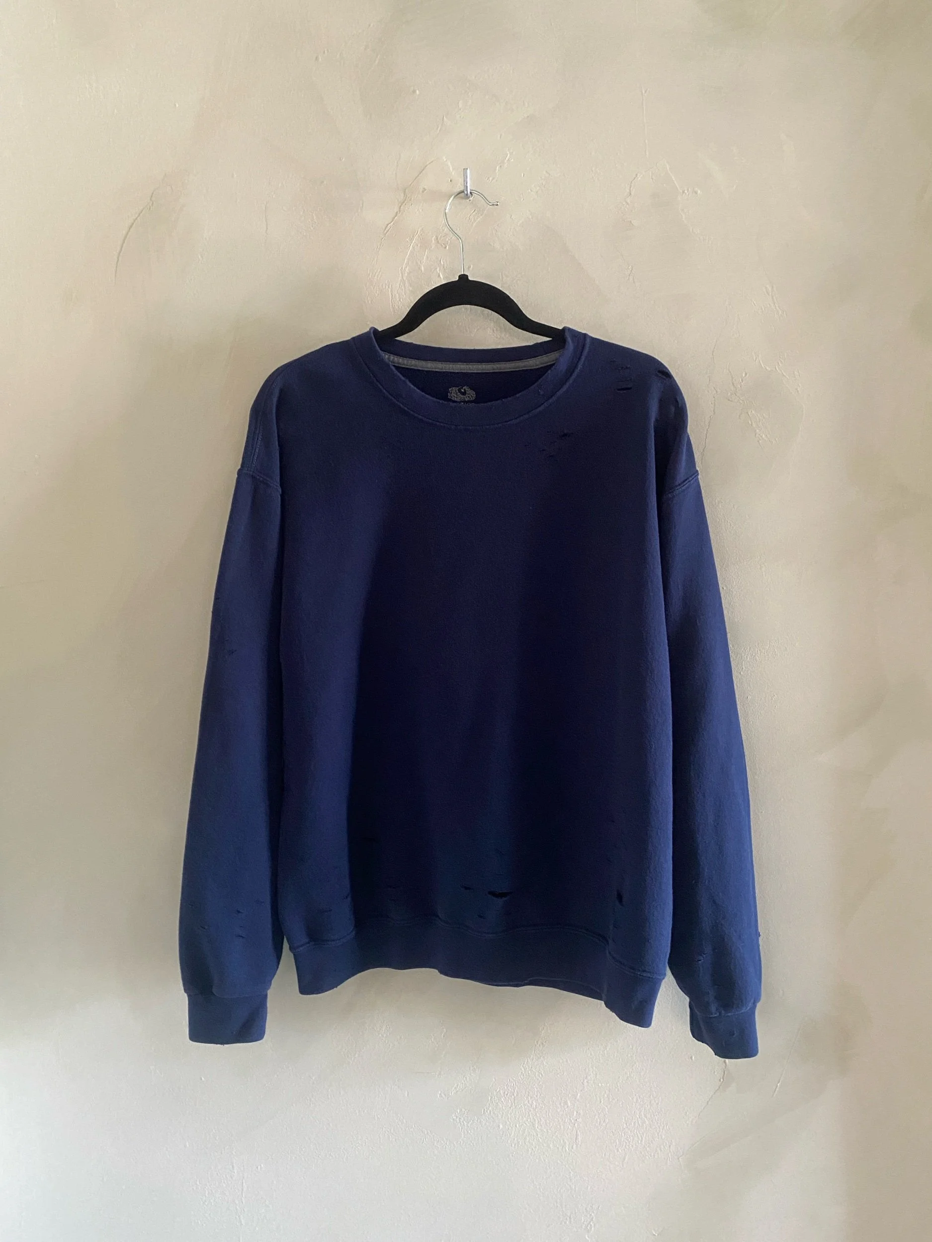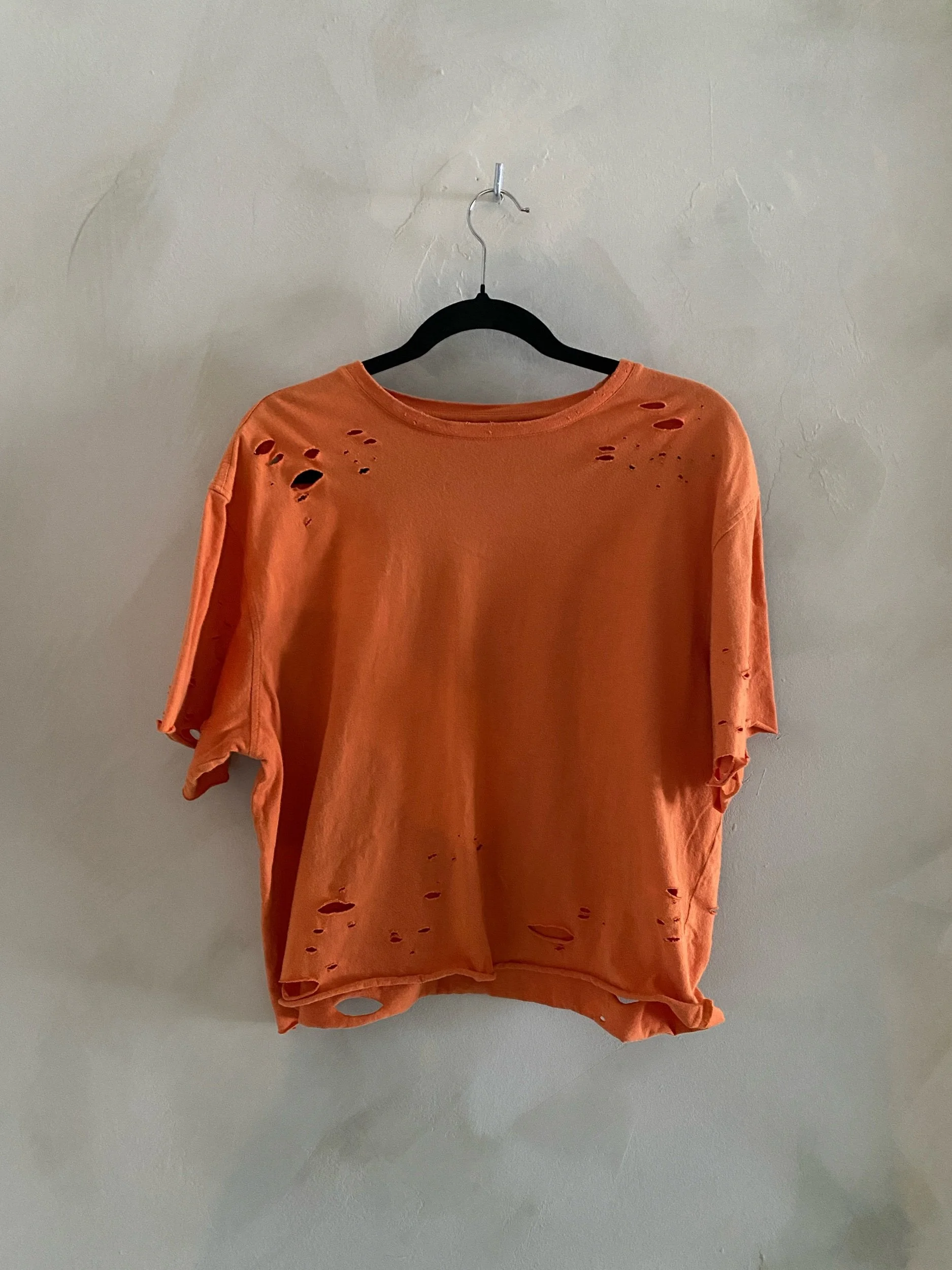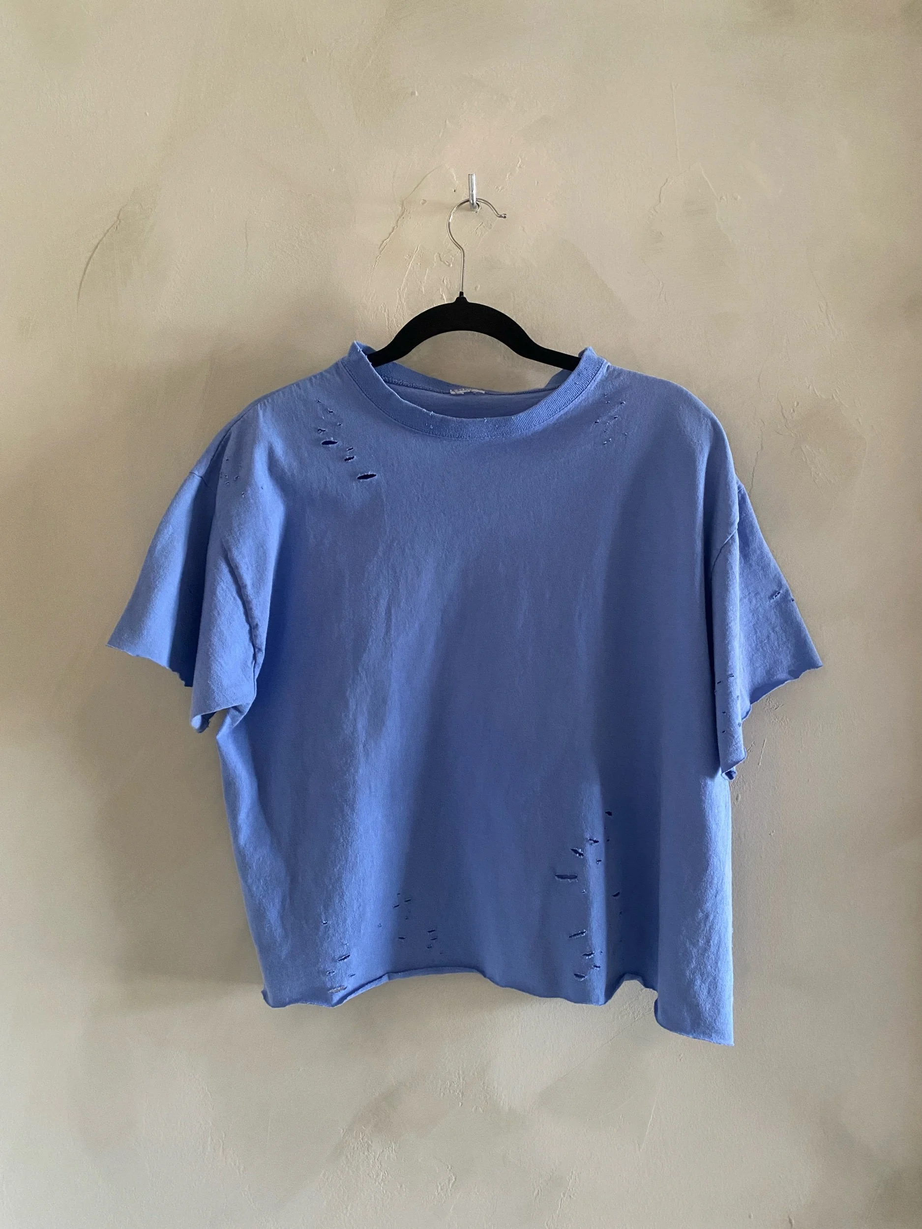 sourced pre-loved from a Michigan thrift shop, cropped with raw edge hems then given unique distressing throughout for a well-worn look