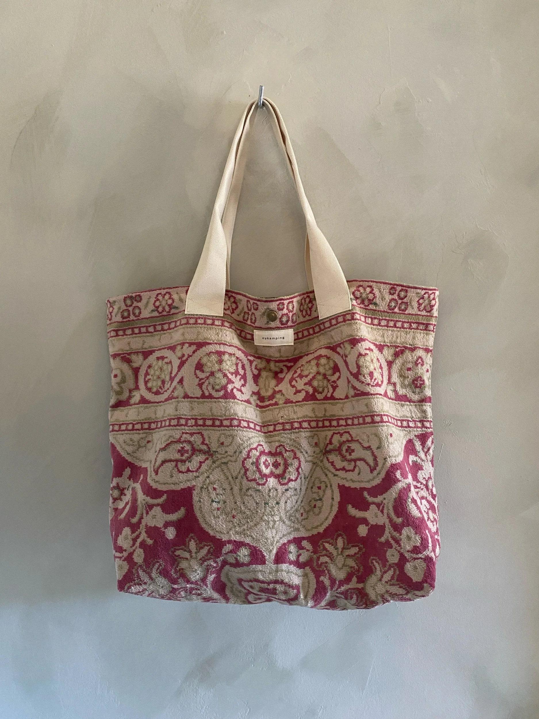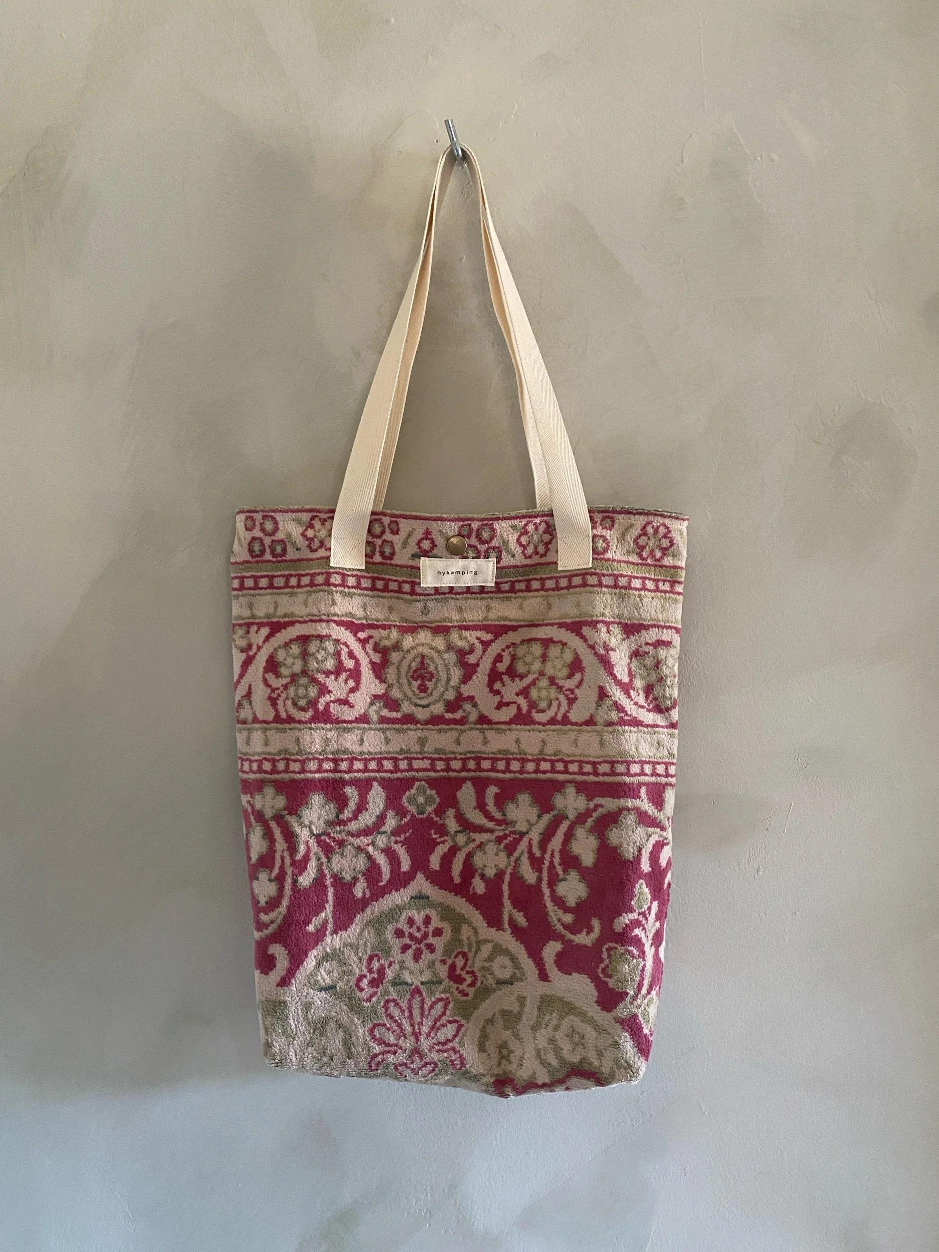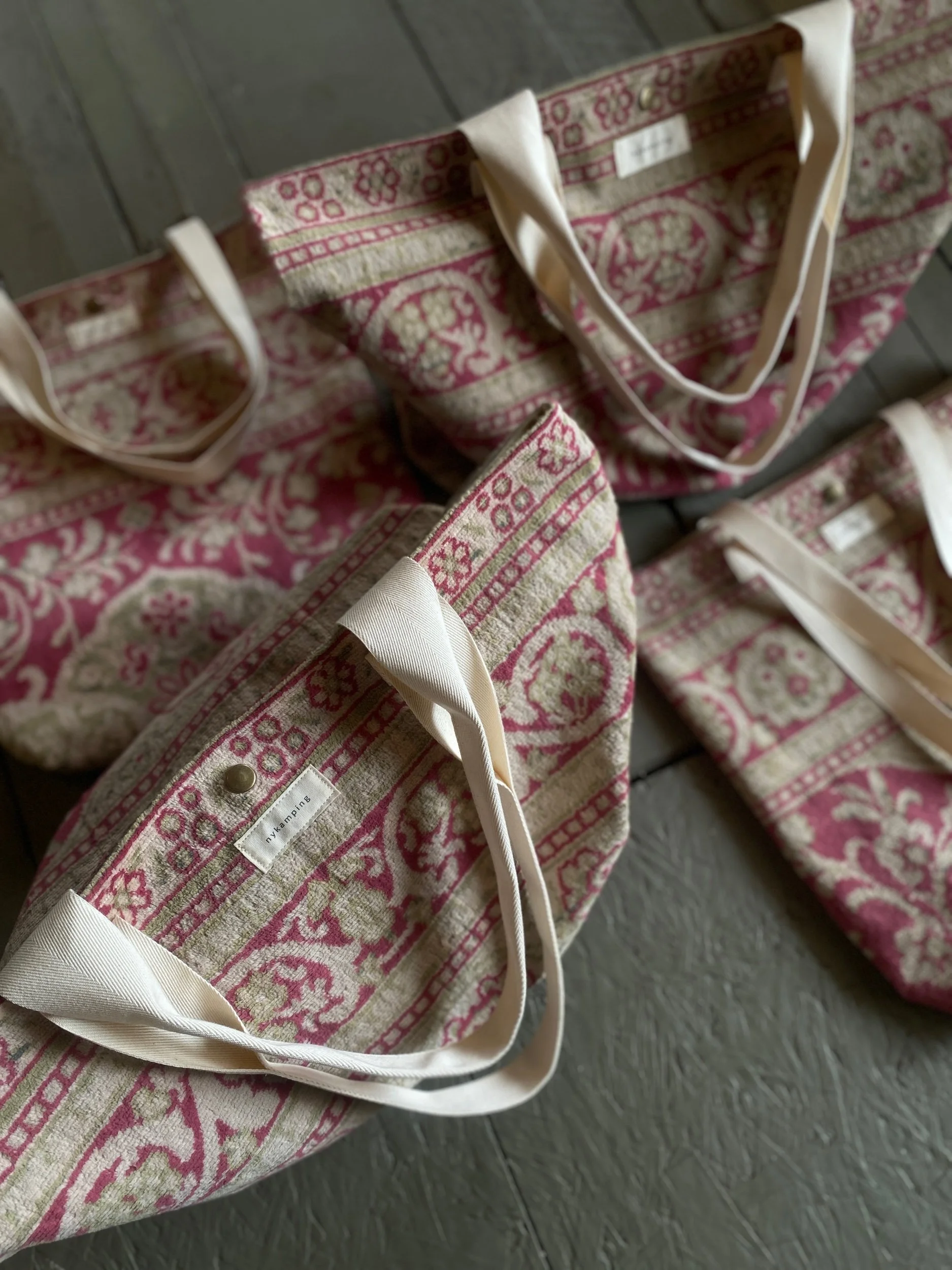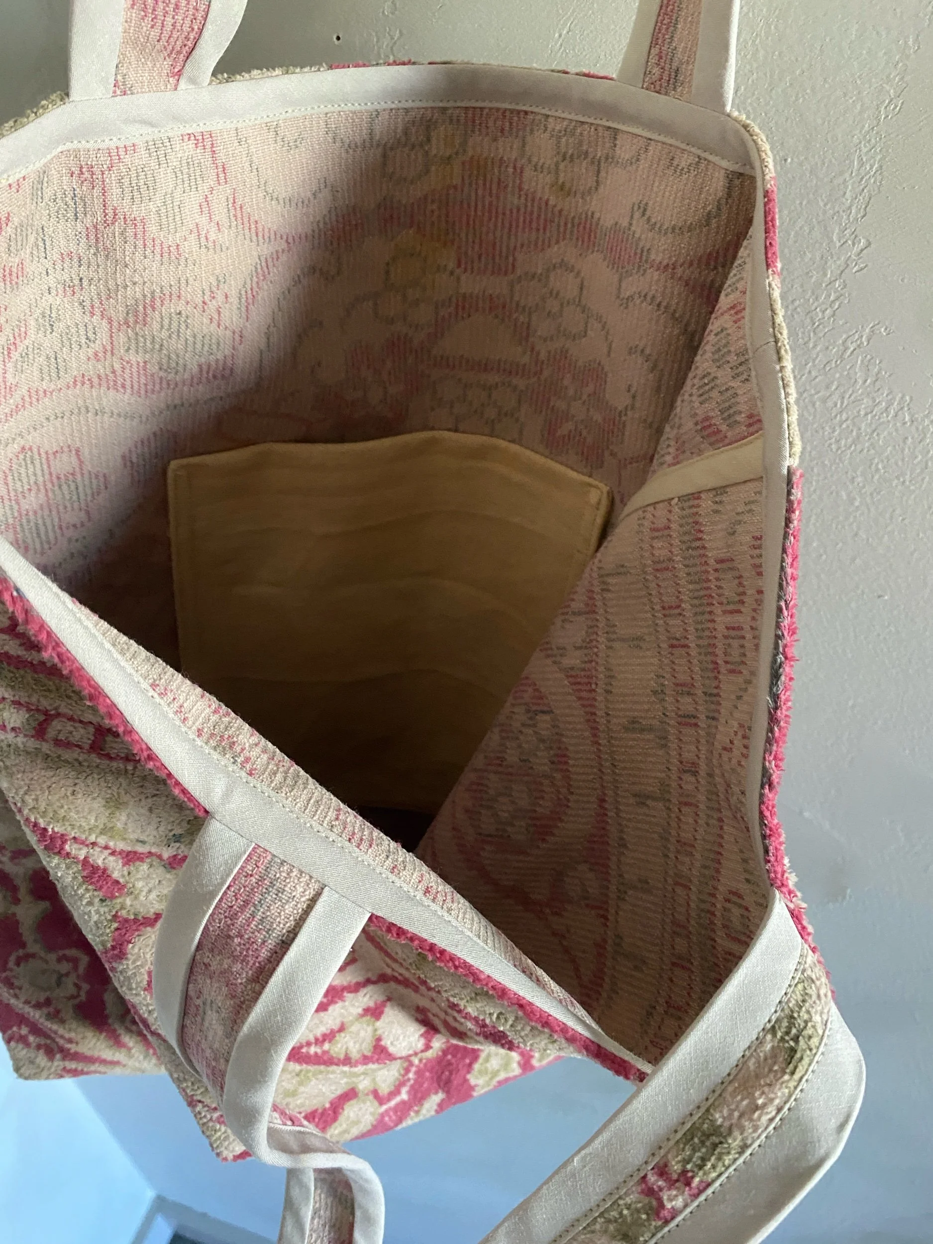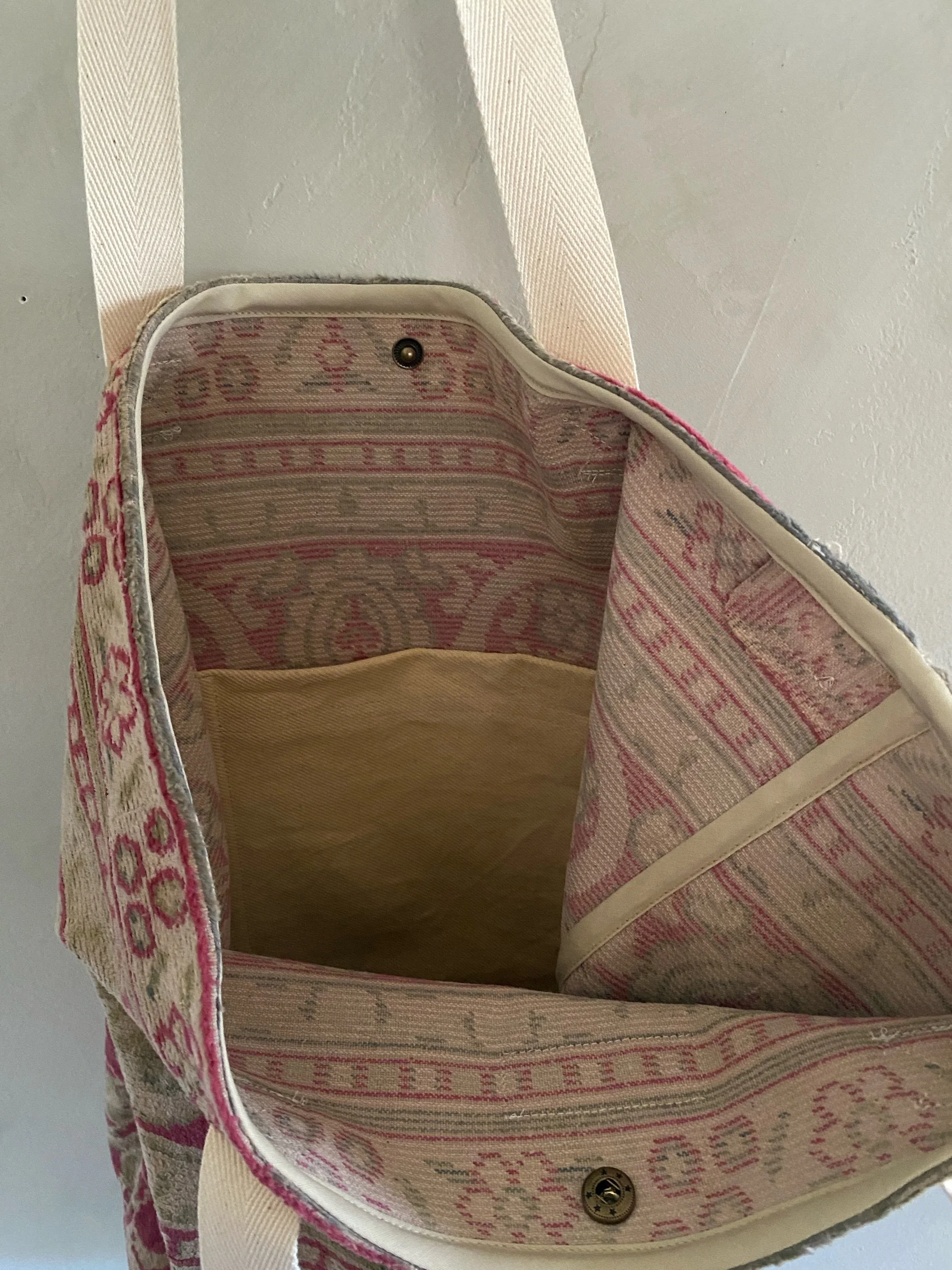 soft bag made from a deconstructed silk rug, with sturdy shoulder straps & bias tape seams