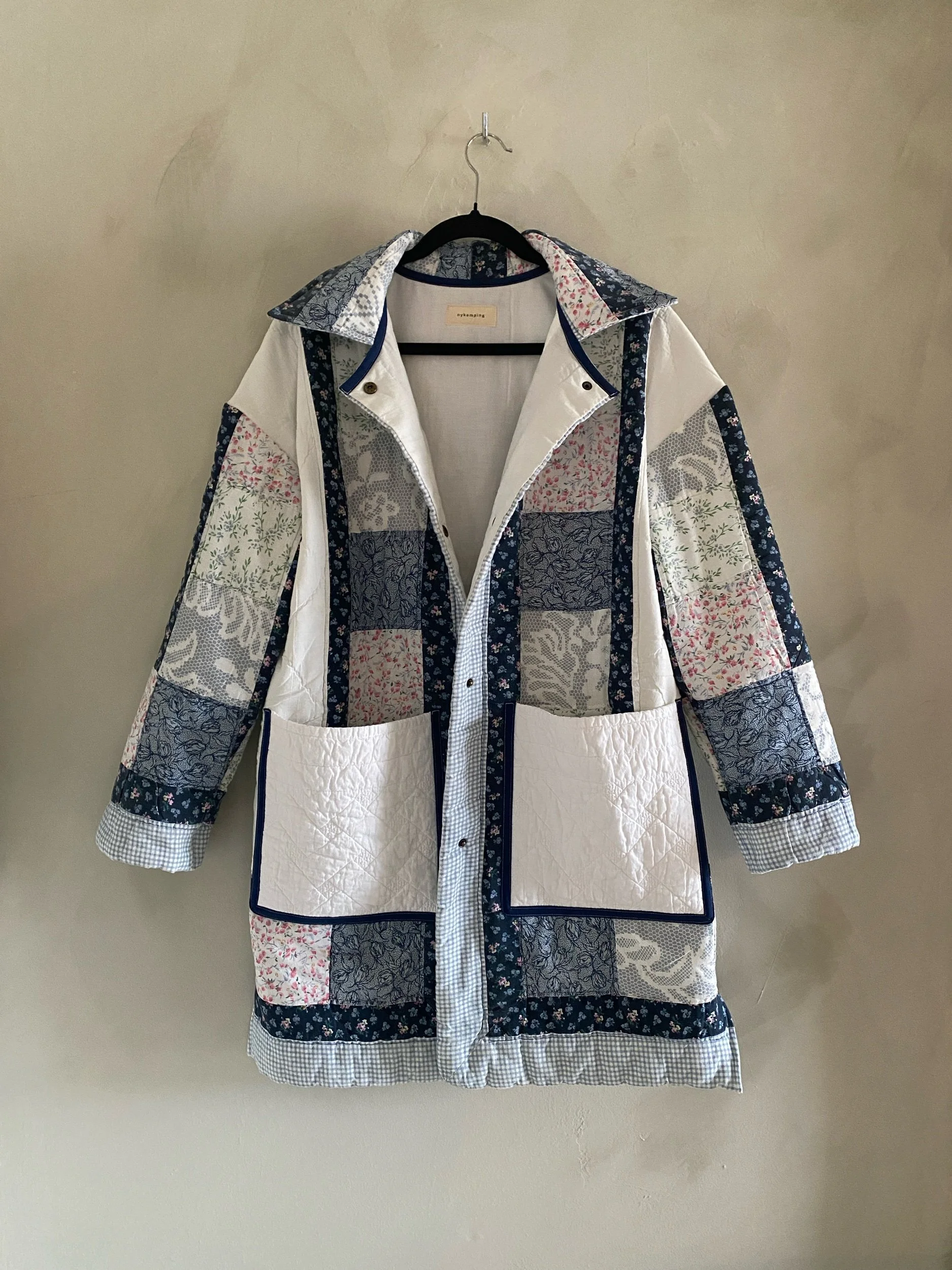 a more fitted silhouette than most nykamping jackets, this lightweight midlength quilted jacket is equipped with chore pockets, brass snap closures & a pointed collar